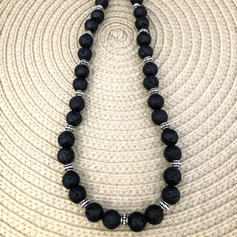 Mens Black Lava and Mushroom Agate Beaded Necklace
