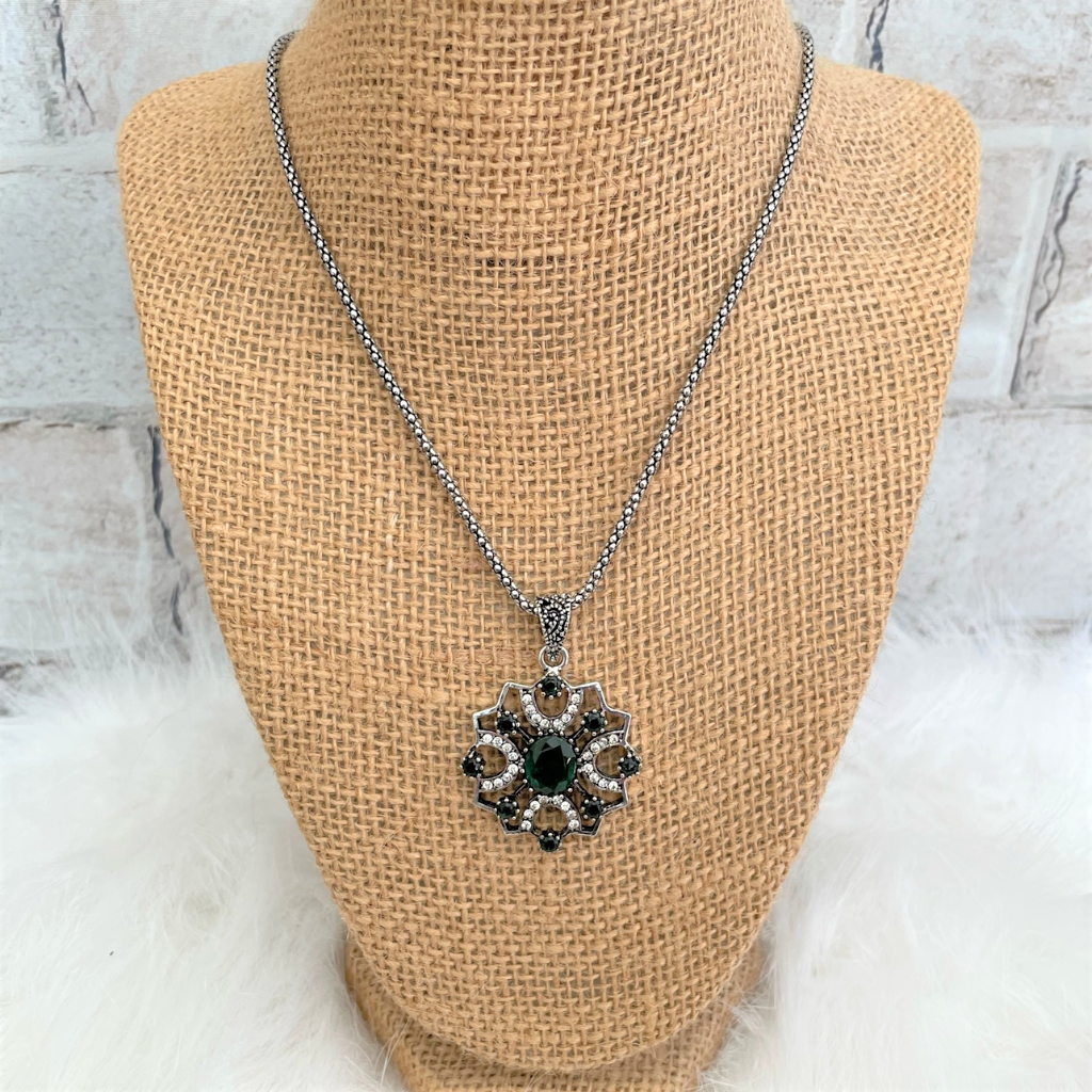 Antique Green Stone and Silver Ornate Pendant Necklace