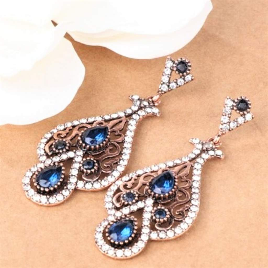 Antique Silver Flower with Blue Tassel Dangle Earrings