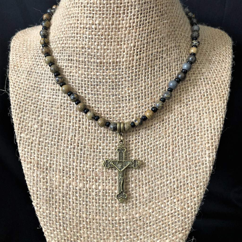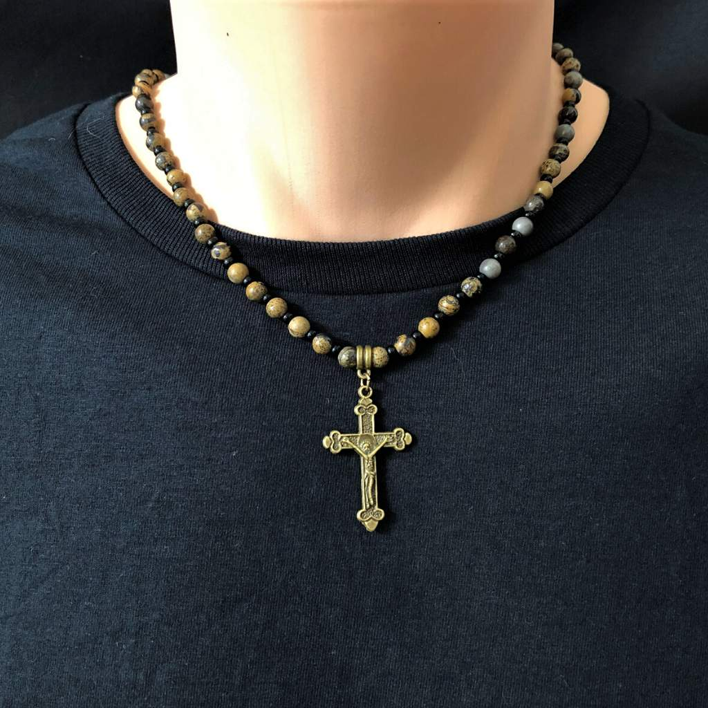 Artistic Stone Mens Brown Beaded Necklace with Silver Cross
