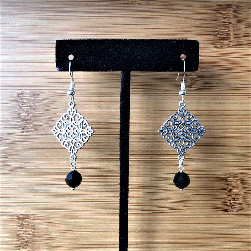 Silver Ornate Diamond and Black Crystal Dangle Earrings