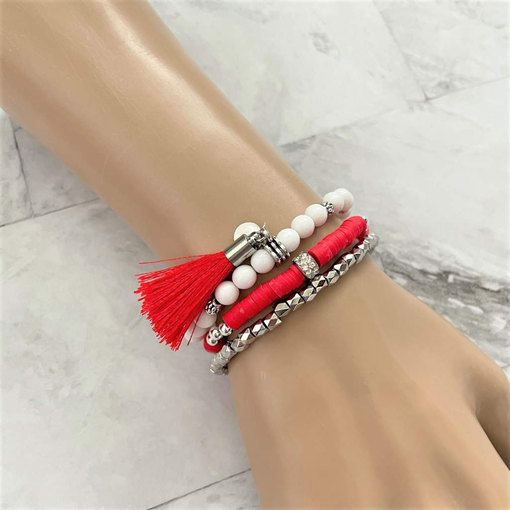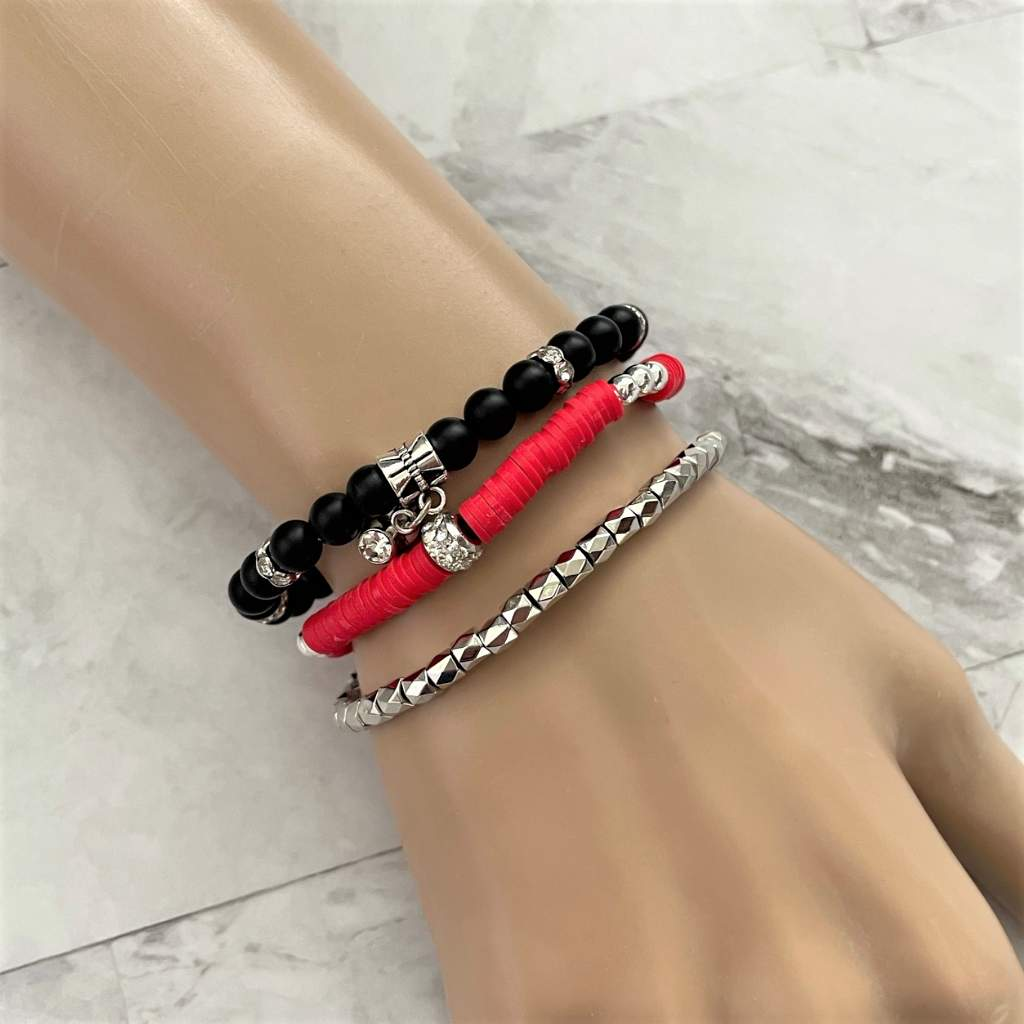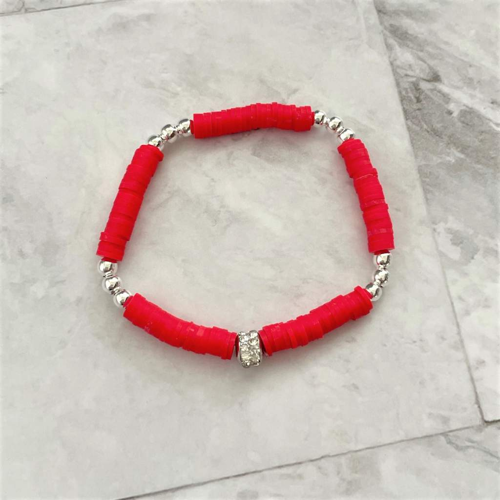 Playful red polymer clay beads, each 5mm wide, mingle with shiny 4mm silver rounds. A sparkling crystal bead takes center stage on this stretchy bracelet, adding a fun pop of charm.