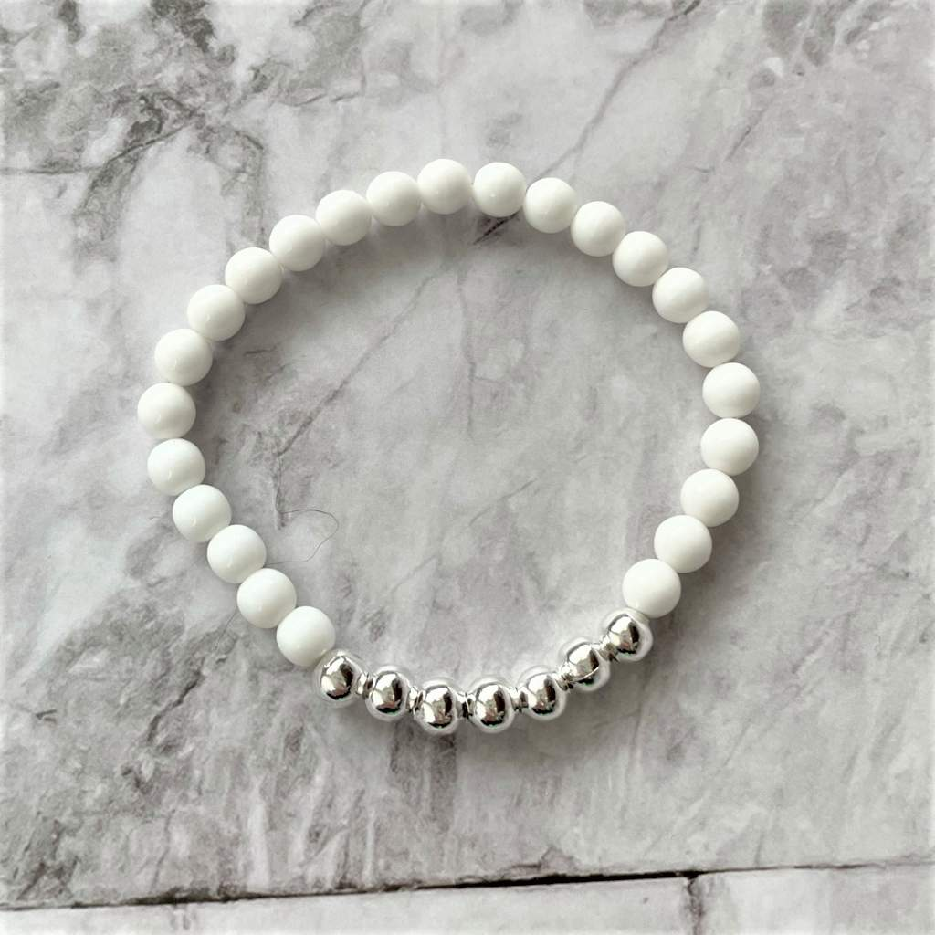 This playful stretch bracelet features 6mm white Czech beads paired with a sparkly row of silver metal beads, combining charm and comfort in every wear.