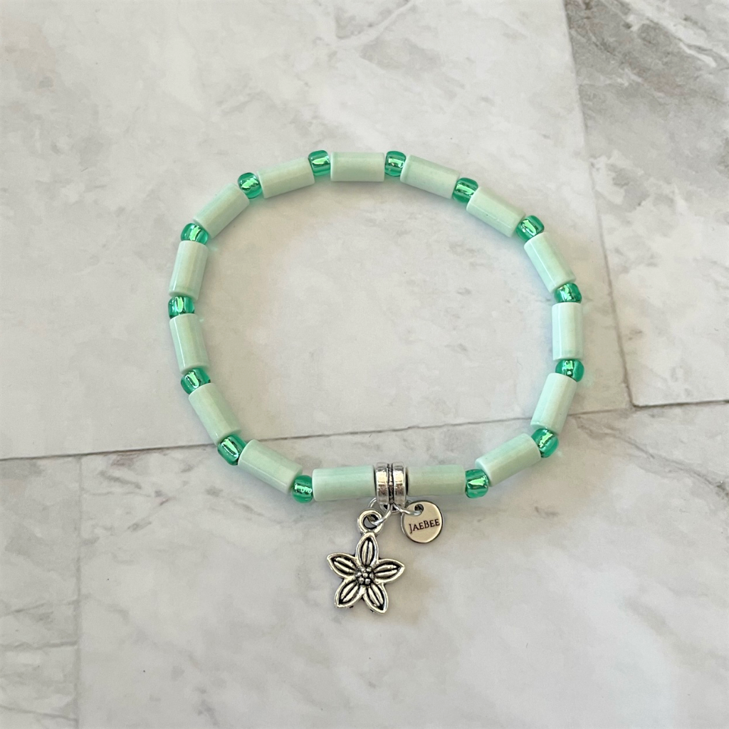 This delightful bracelet showcases mint green Agate tube beads, each 8x4mm, paired with sparkling silver-lined peridot Toho beads. A cute silver flower charm swings playfully, while the stretch design makes it a breeze to wear.