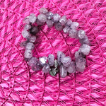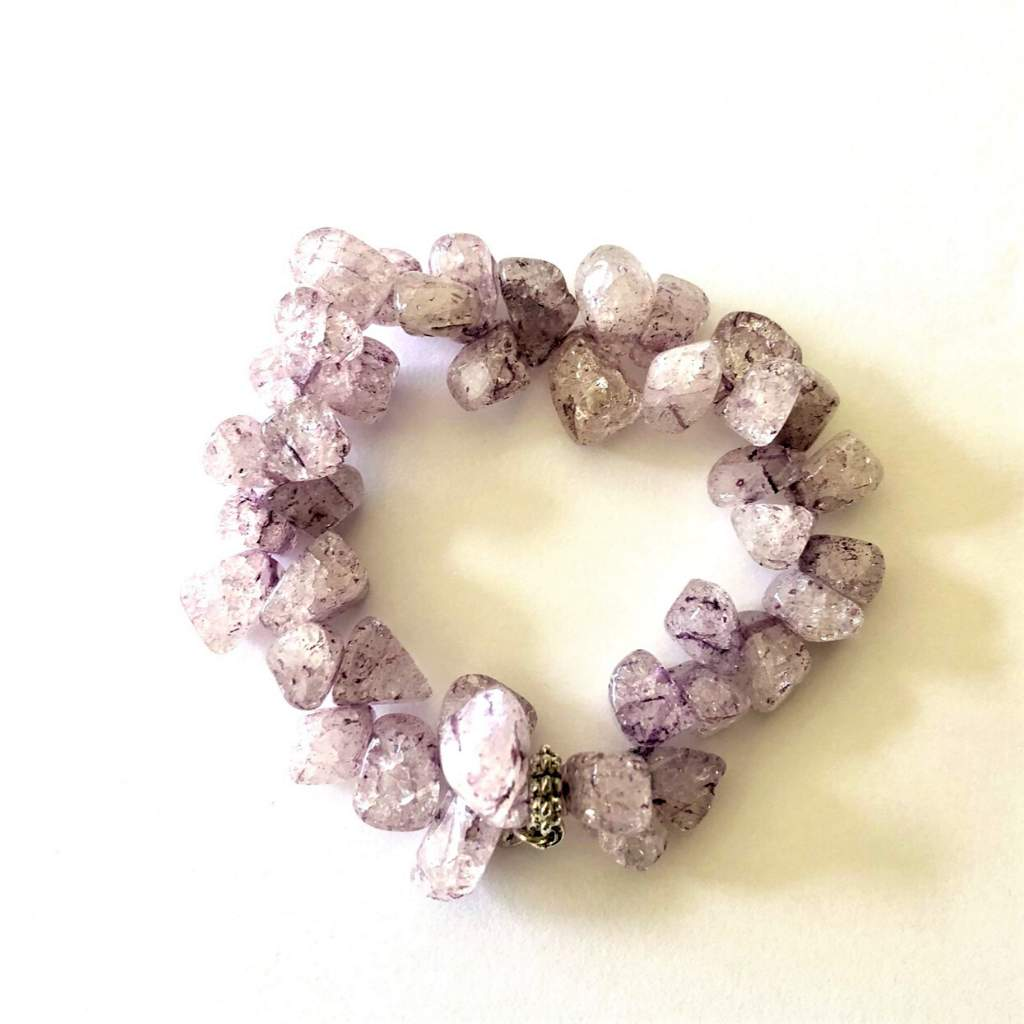 This fun stretch bracelet features semi-transparent purple Quartz beads with a unique crackle effect, giving each bead a cool veined pattern. It’s finished with a shiny silver bead at the center for a little extra sparkle.