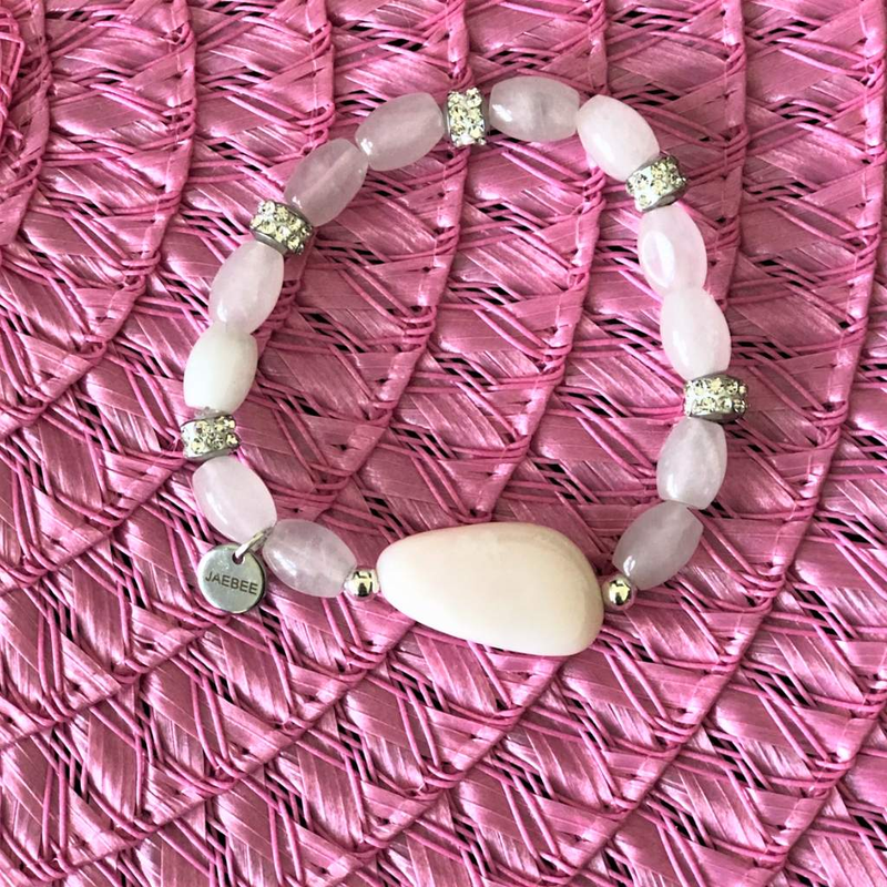 This stretch bracelet features soft pink Rose Quartz barrel stones highlighted by silver crystal spacer beads. At its center, a sizable natural pale pink Opal stone serves as the focal point, combining elegance with natural beauty.