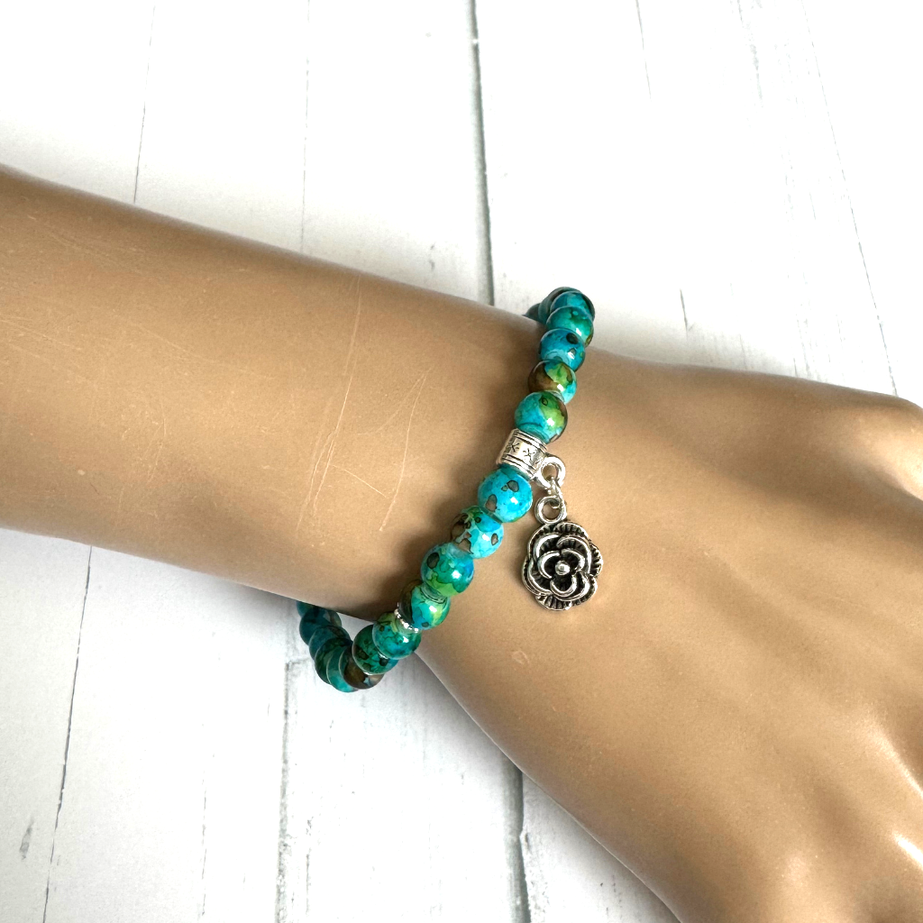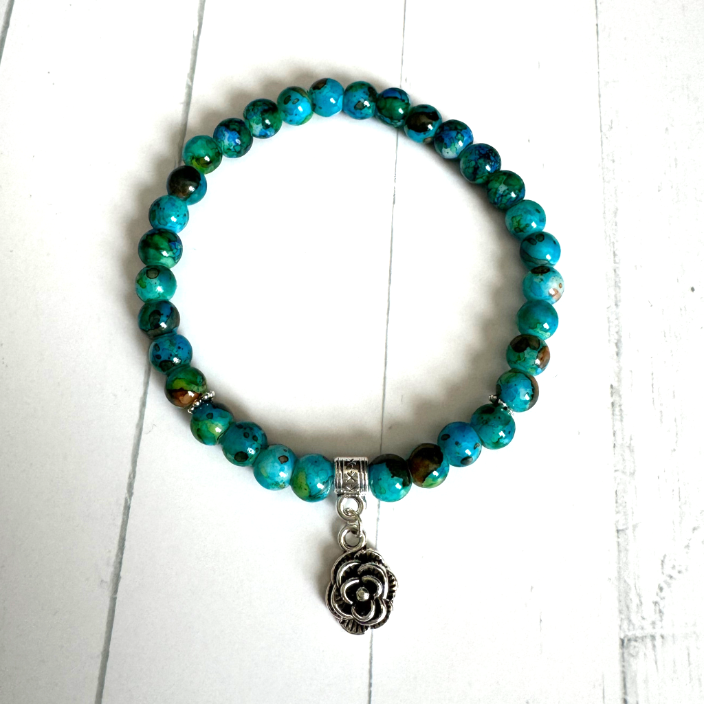 This cheerful stretch bracelet showcases 6mm turquoise glass beads with fun brown and green marbled swirls, finished with a charming silver flower charm measuring 6/16".