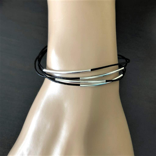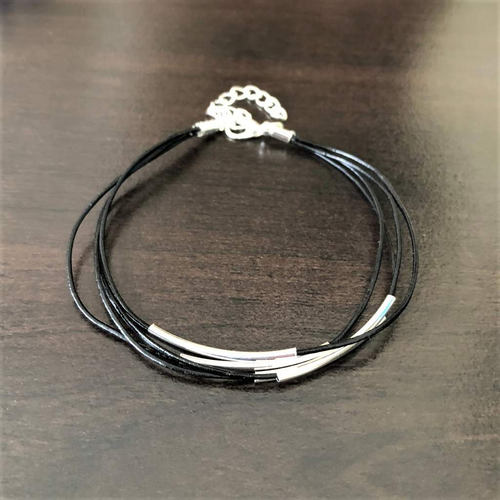 Black Leather Multi Strand and Silver Tube Bracelet