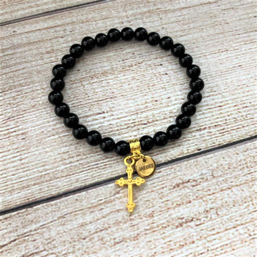 Black Onyx Beaded Bracelets and Gold Cross Bracelets