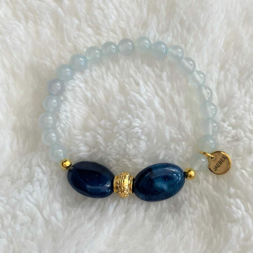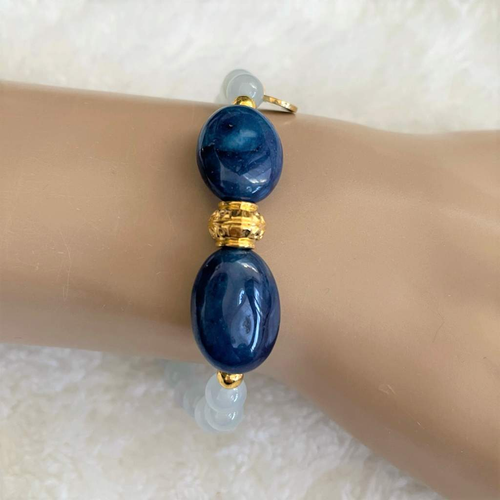 Blue Quartz and Blue Agate Beaded Bracelet with Gold Beads