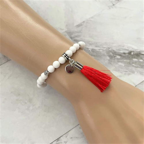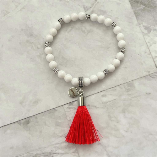 White Czech Glass Beaded Bracelet with Red Tassel