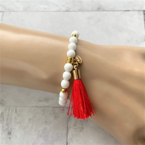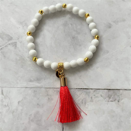 White Czech with Red Tassel and Gold Beaded Bracelet