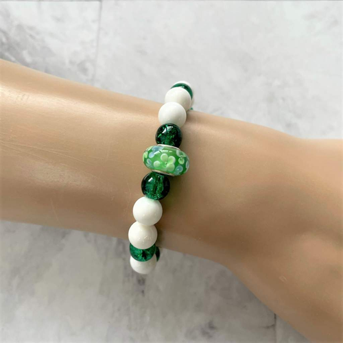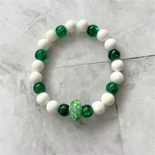 White Shell and Green Glass Beaded Bracelet with Accent Green Bead