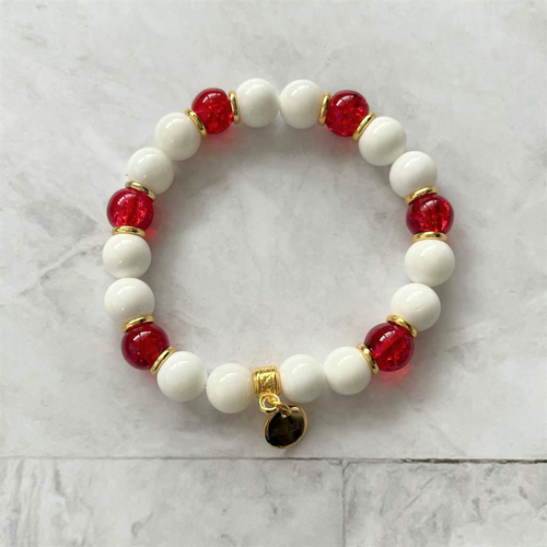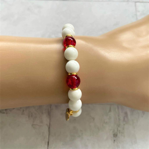 White Shell and Red Glass Gold Beaded Bracelet