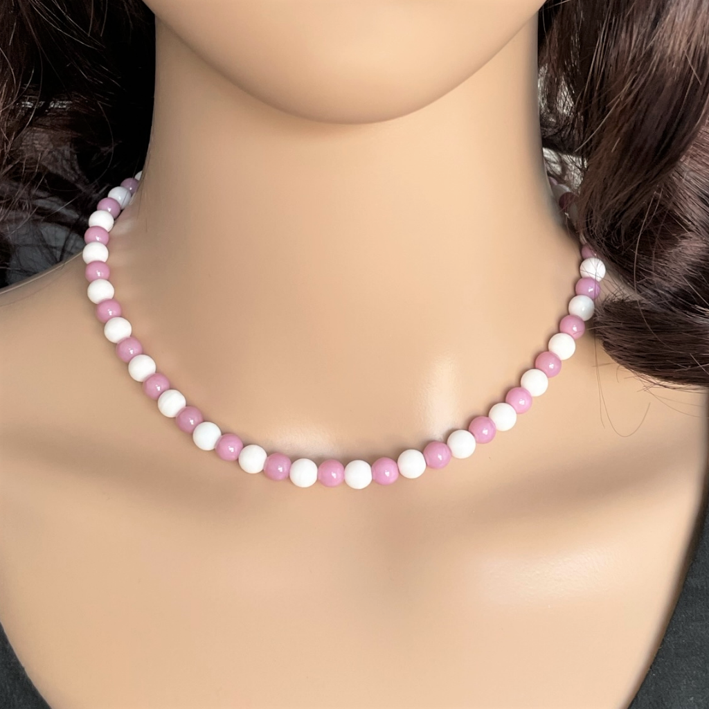 This necklace featuring lavender and white beads is ideal for adding style to your everyday look. The fashionable lavender beads bring a splash of color, complemented by timeless white beads for a balanced design. Measuring 14" with 6mm Czech glass beads, it fastens securely with a lobster clasp. Elevate your outfit effortlessly with this charming accessory.