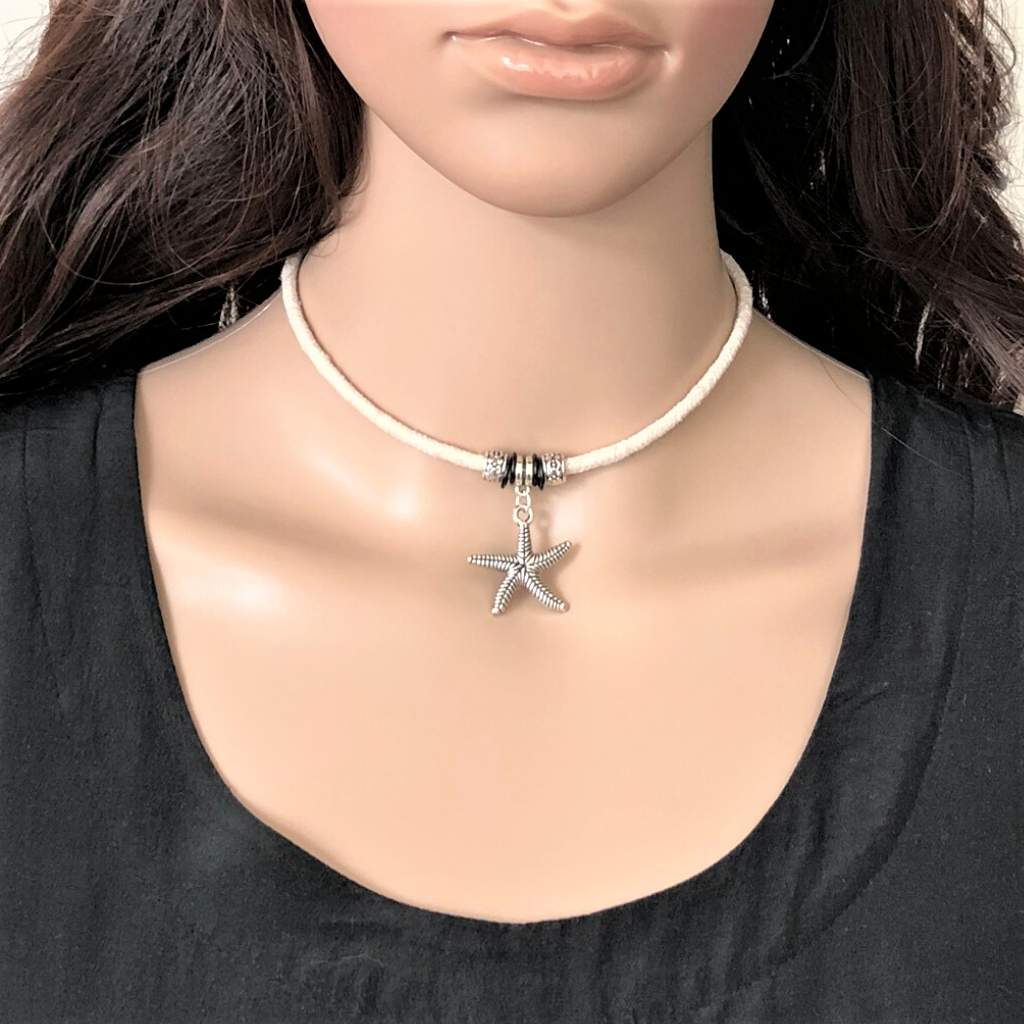 This necklace features a textured silver starfish charm suspended on a white cotton cord, enhanced with silver and black accent beads. The starfish charm is 1" in size, and the choker length is 12" with an additional extension for adjustable wear.