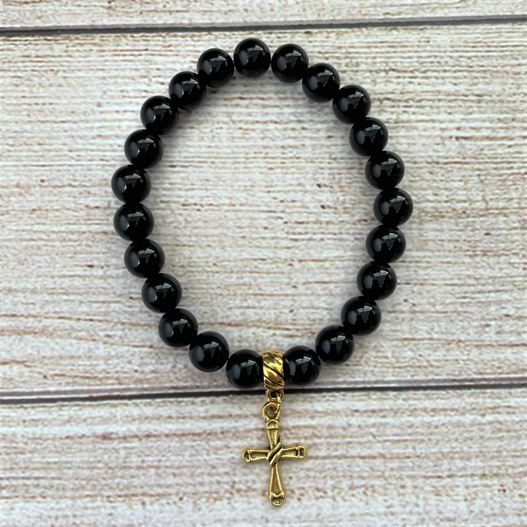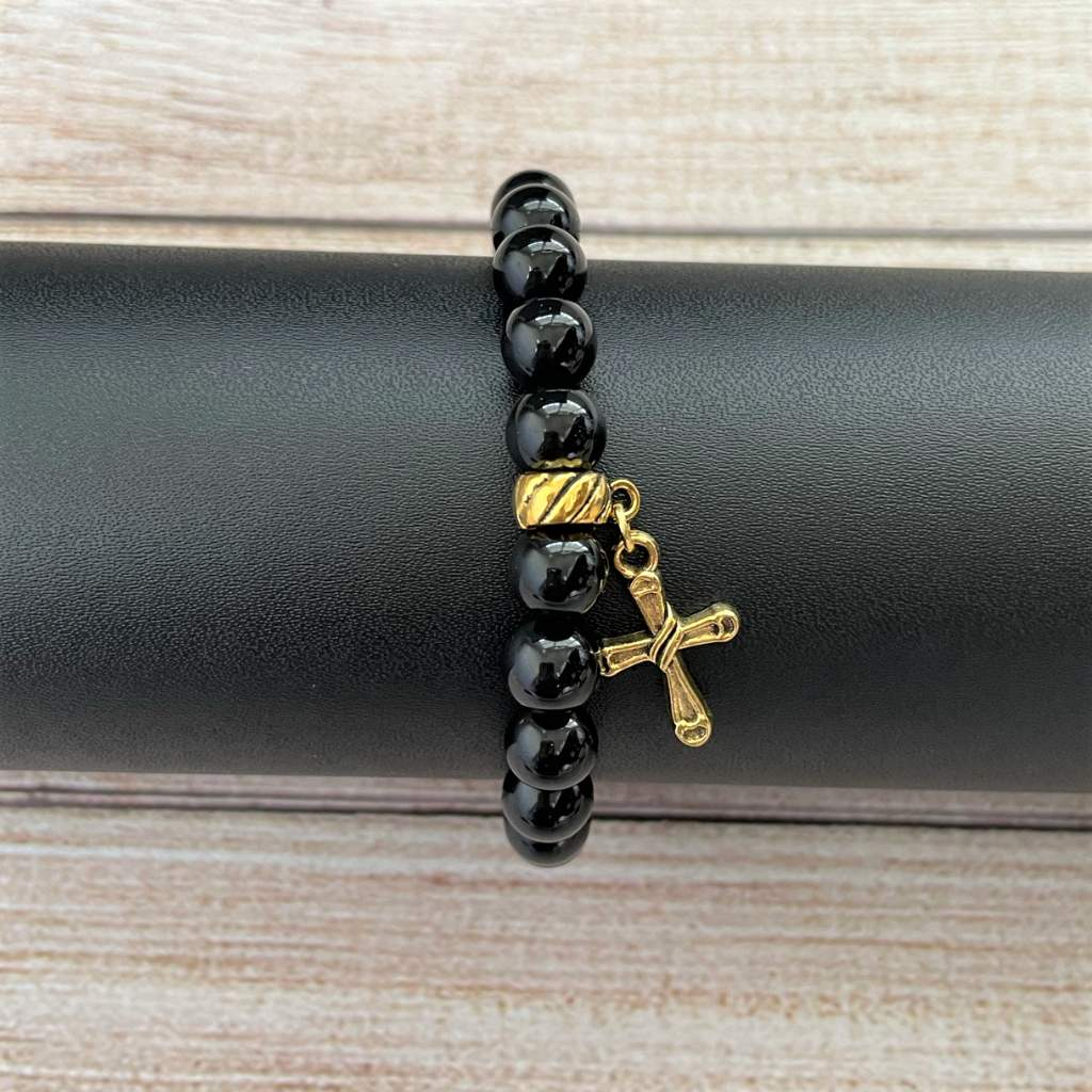 Black Onyx Mens Beaded Bracelet with Gold Cross Charm