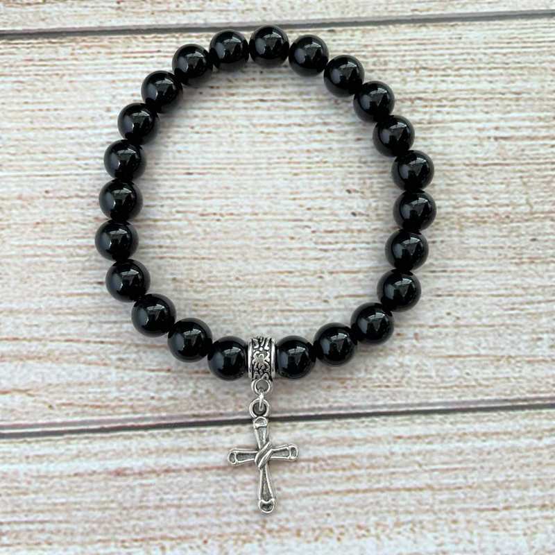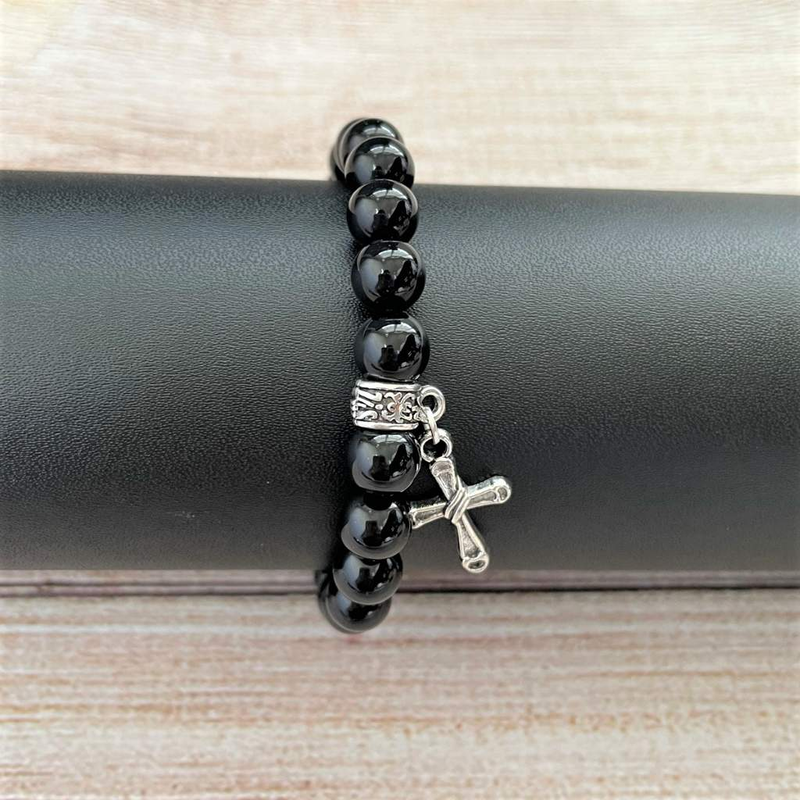 Elevate your everyday look with this sophisticated Black Onyx beaded bracelet, designed specifically for the modern man. Featuring smooth 8mm Matte Onyx beads paired with an elegant 3/4" silver Cross charm, this piece strikes the perfect balance between understated style and meaningful symbolism. The convenient stretch fit ensures effortless wear—no clasps, no complications, just instant sophistication on your wrist.