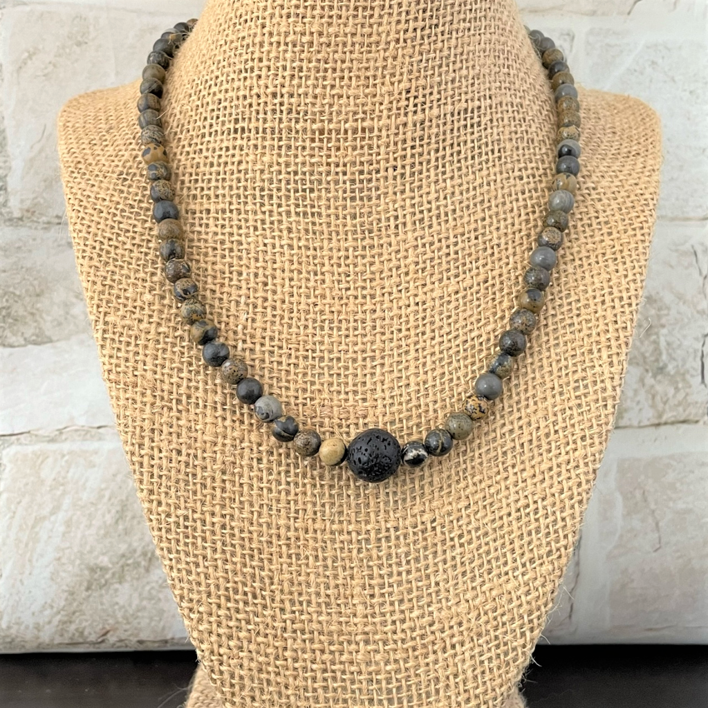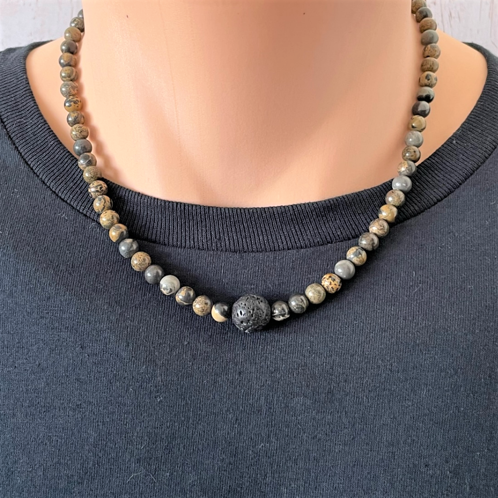 Artistic Stone and Black Lava Mens 6mm Beaded Necklace