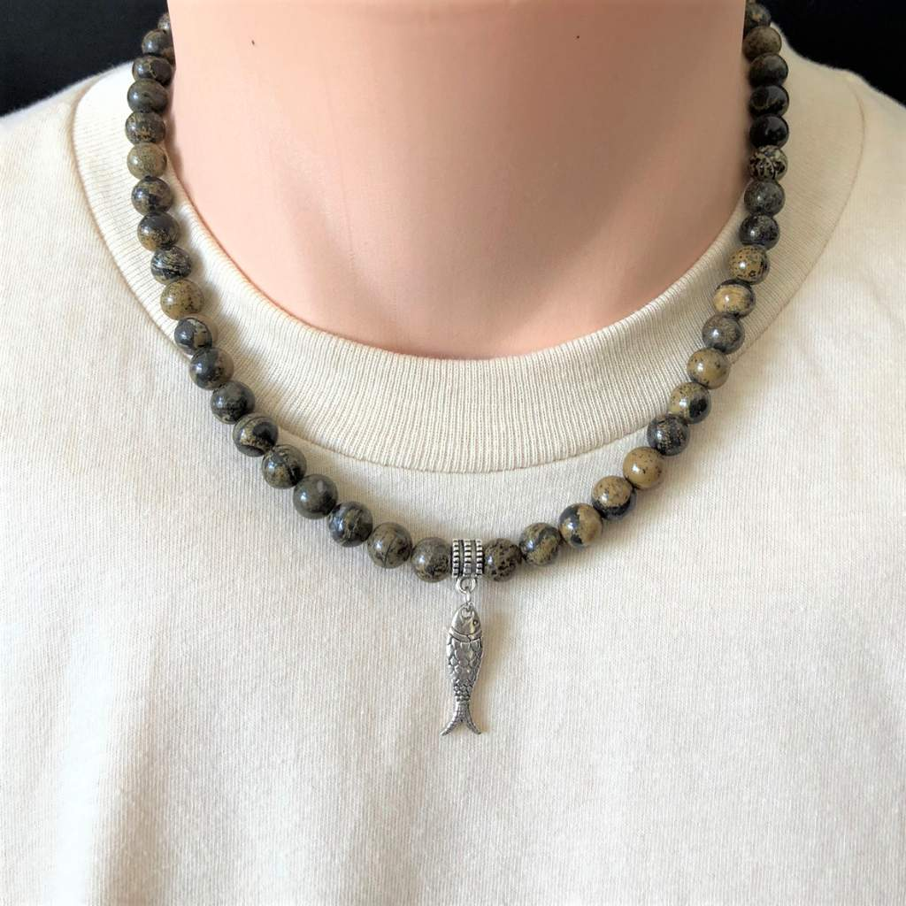 Mens Artistic Stone and Silver Fish Beaded Necklace
