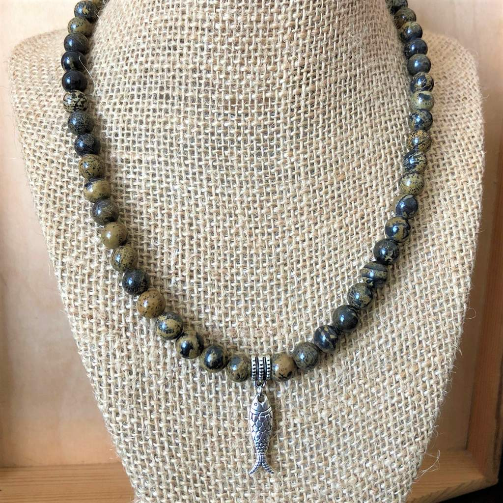 This necklace features artistic stone beads in rich shades ranging from deep brown to light beige. At its center, a 1" silver fish charm adds a distinctive touch. The beads are 8mm in size, and the piece is secured with a stainless steel lobster clasp for lasting wear.