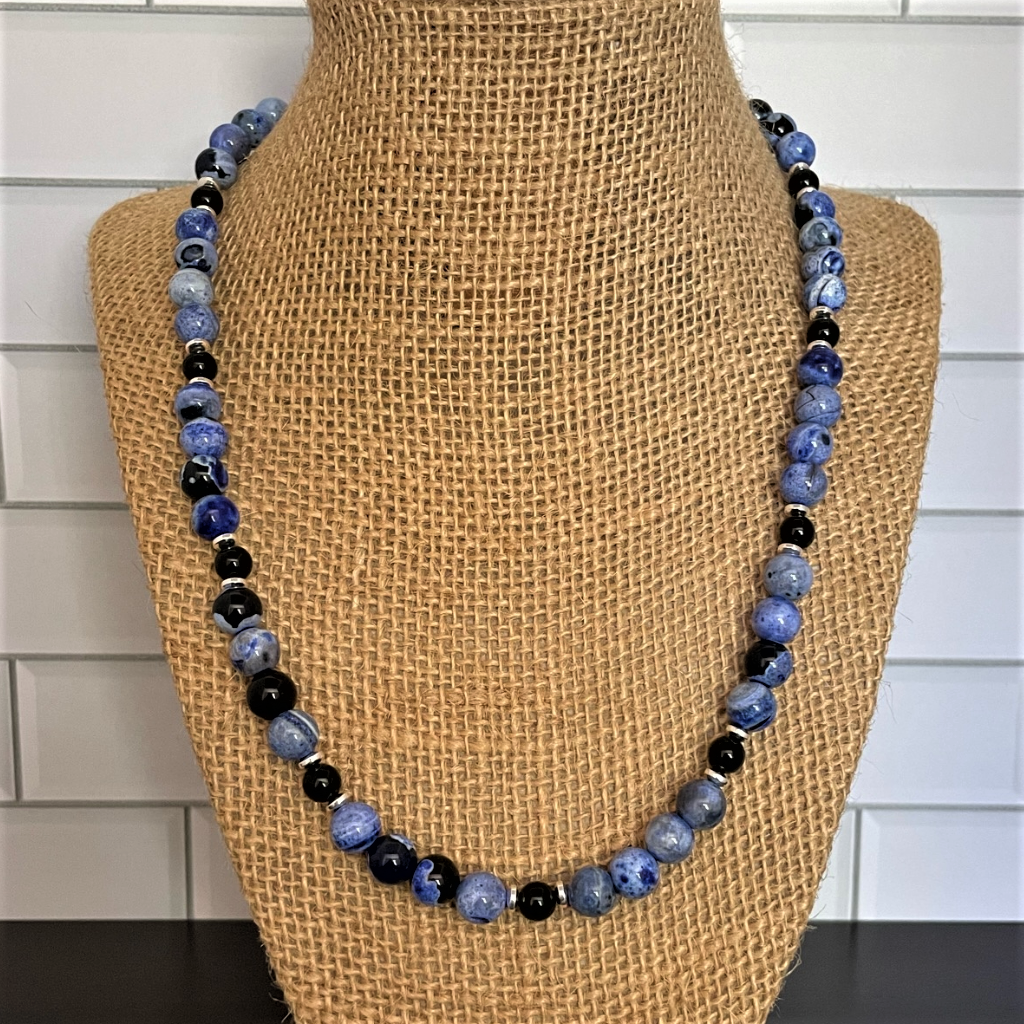 Mens Blue Fire Agate and Black Onyx Beaded Necklace