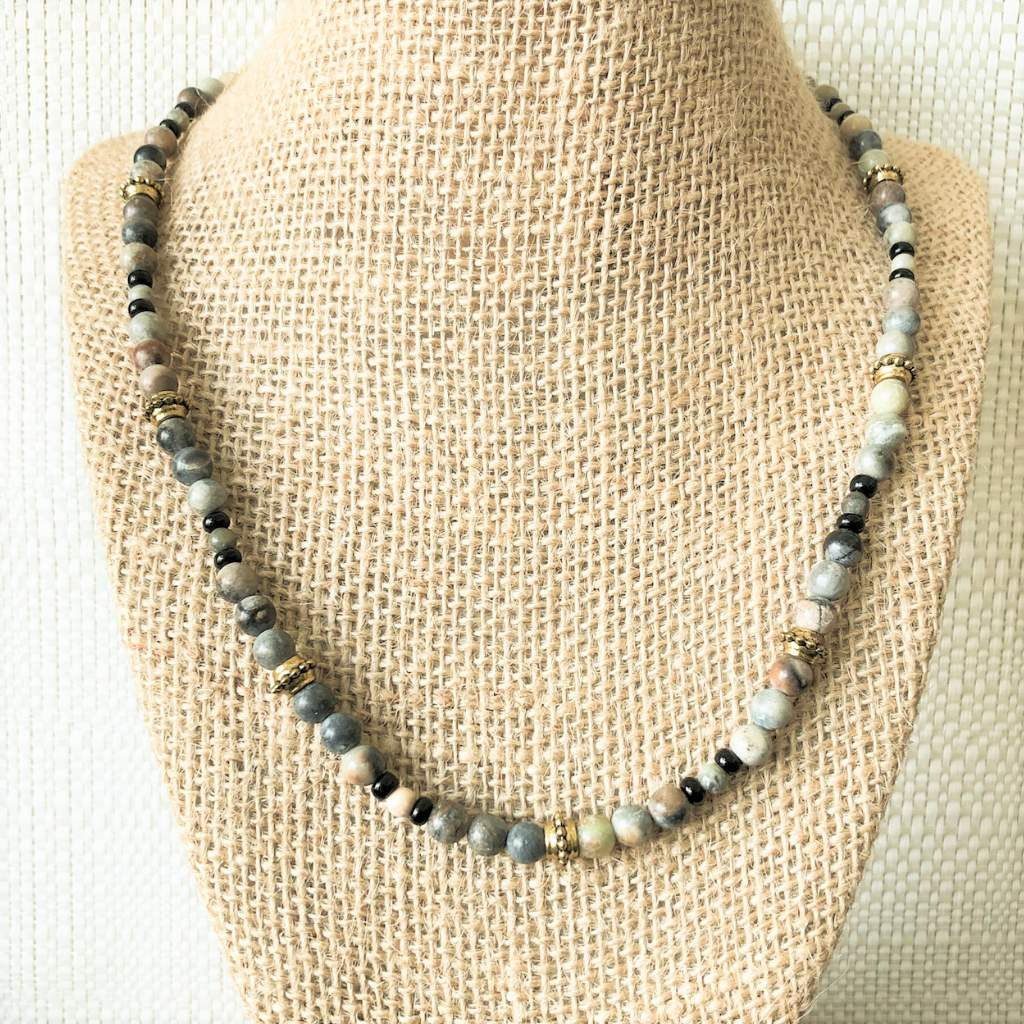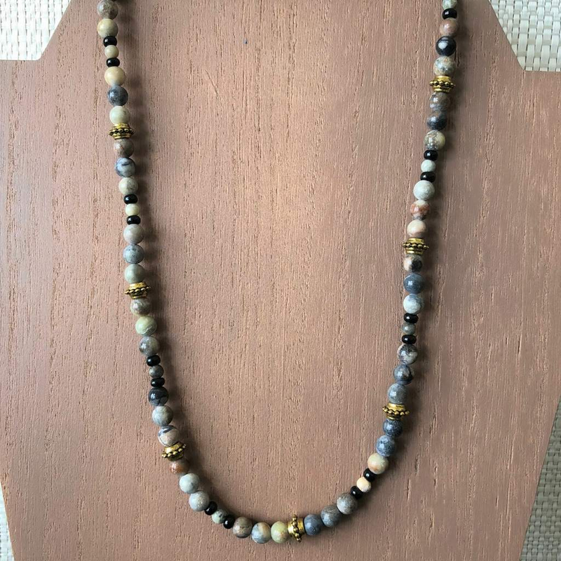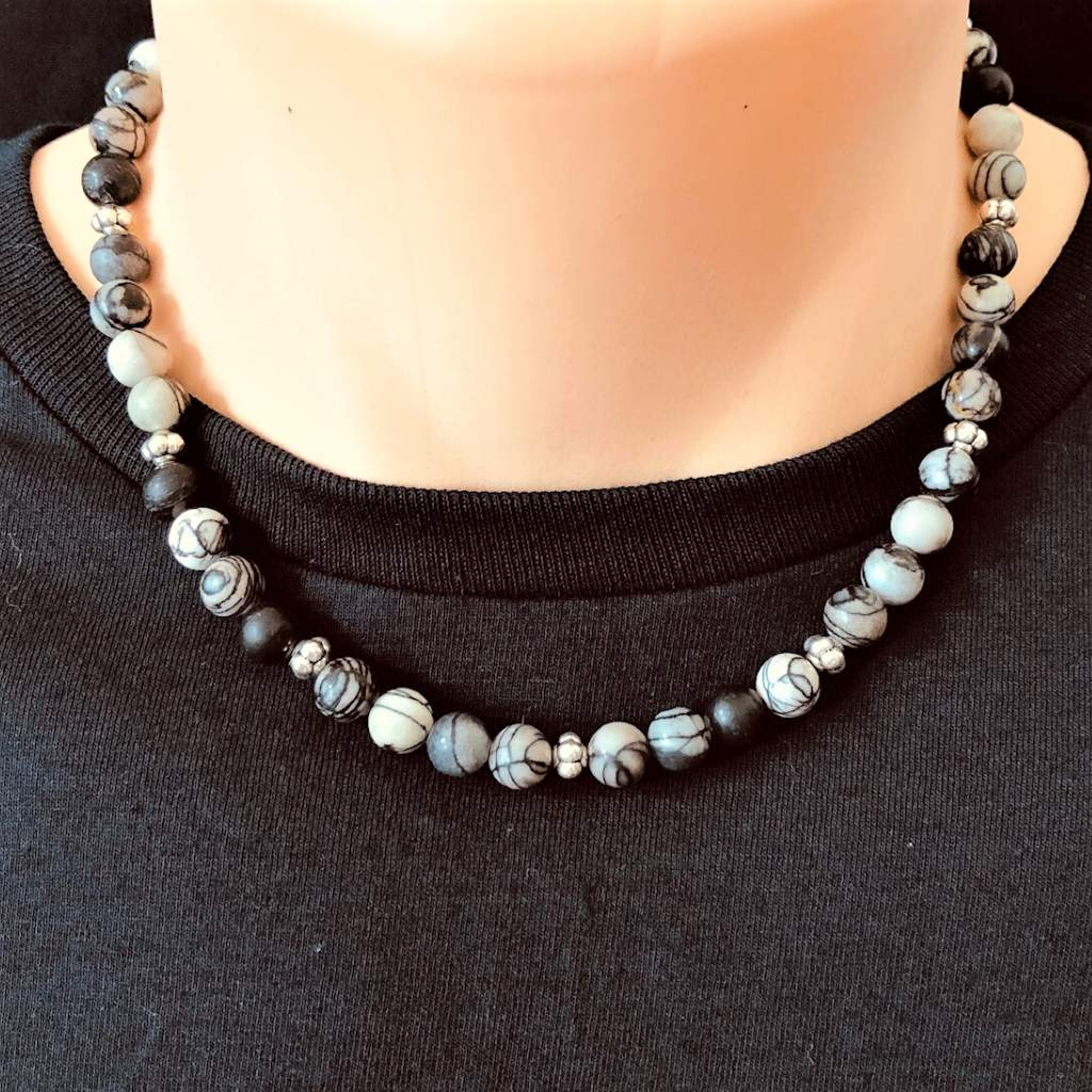 Mens Artistic Stone and Silver Fish Beaded Necklace