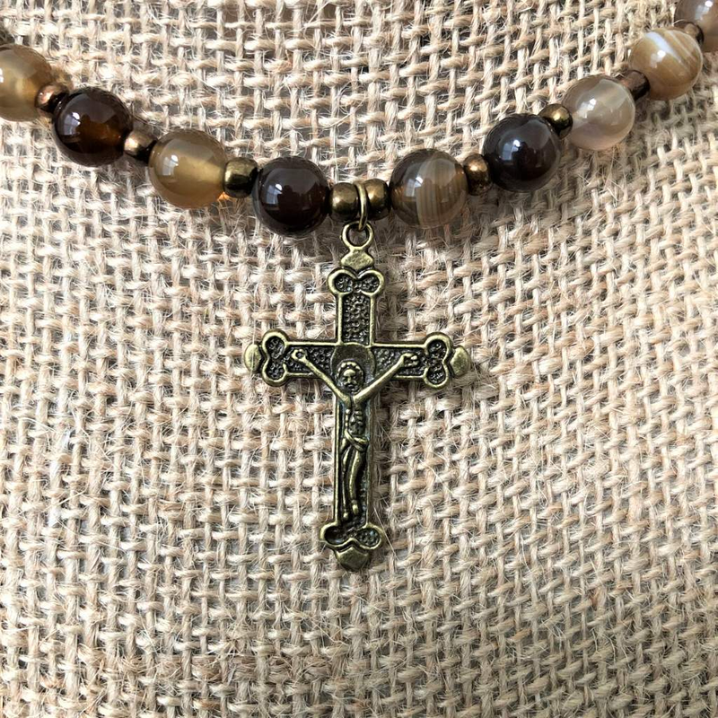 Mens Brown Agate and Brass Cross Beaded Necklace