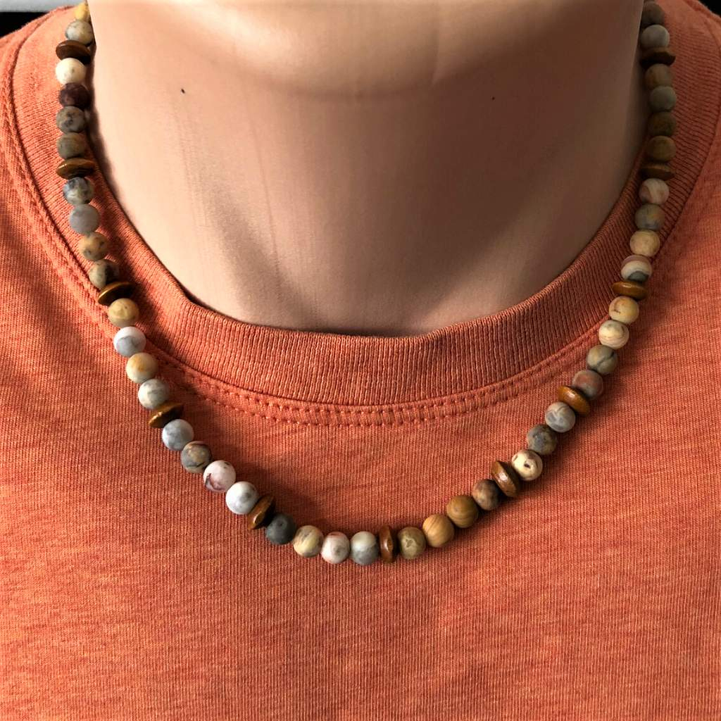 Mens Crazy Lace Matte Agate and Wood Beaded Necklace