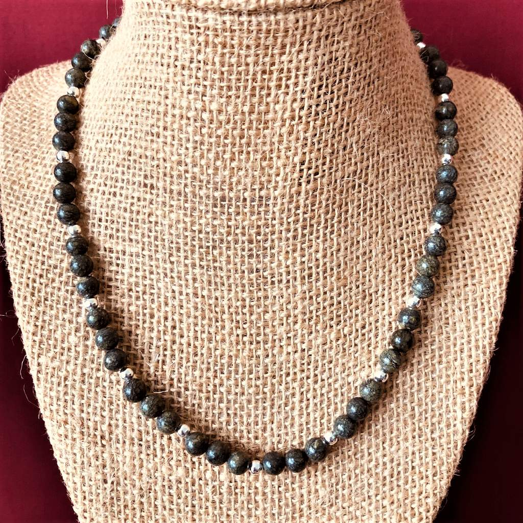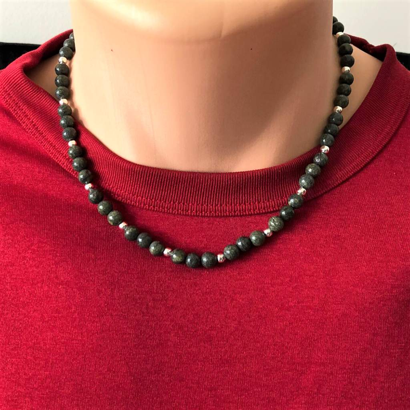 Russian Serpentine and Silver Beaded Mens Necklace