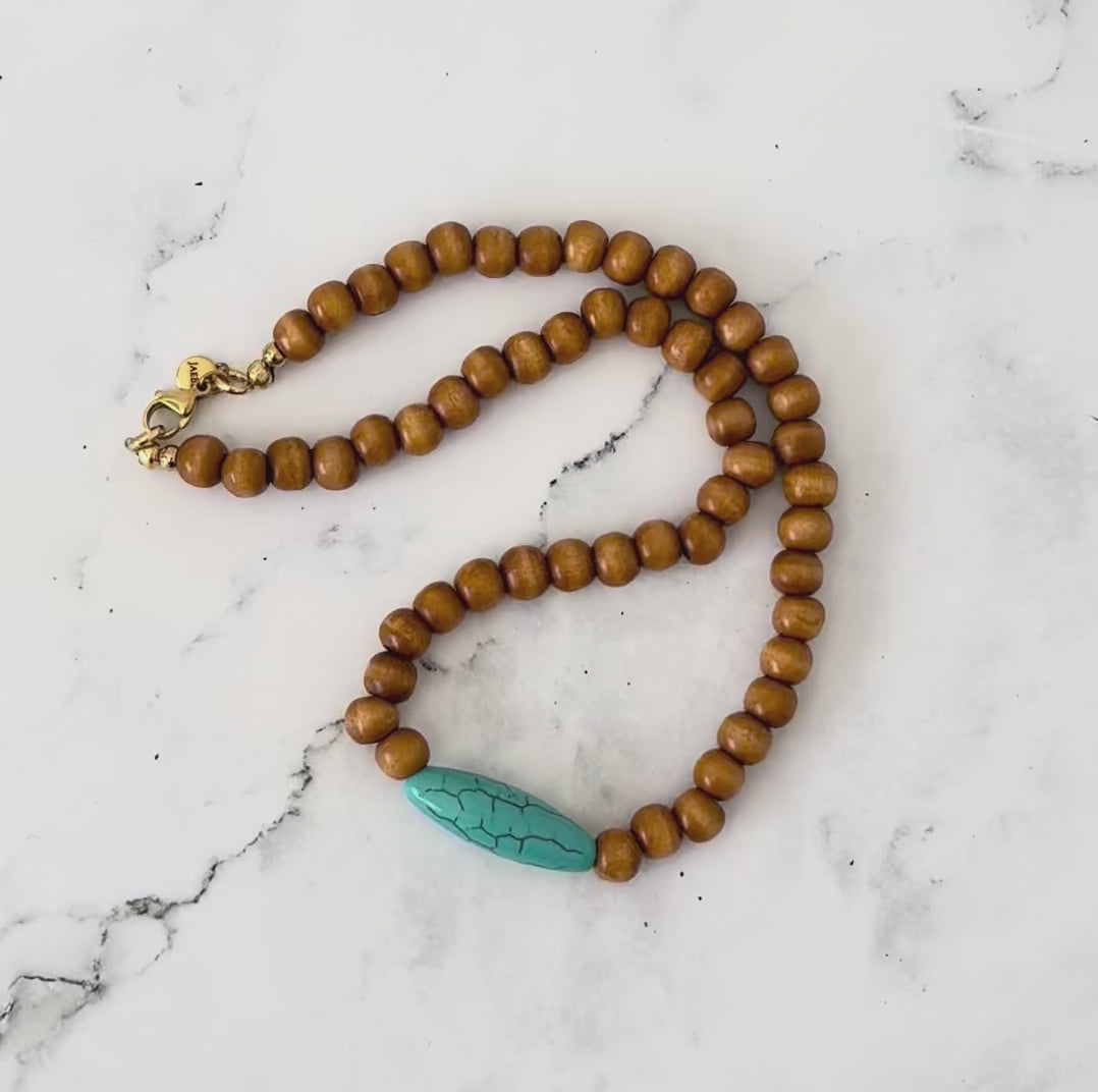 Mens Brown Wood and Turquoise Magnesite Beaded Necklace