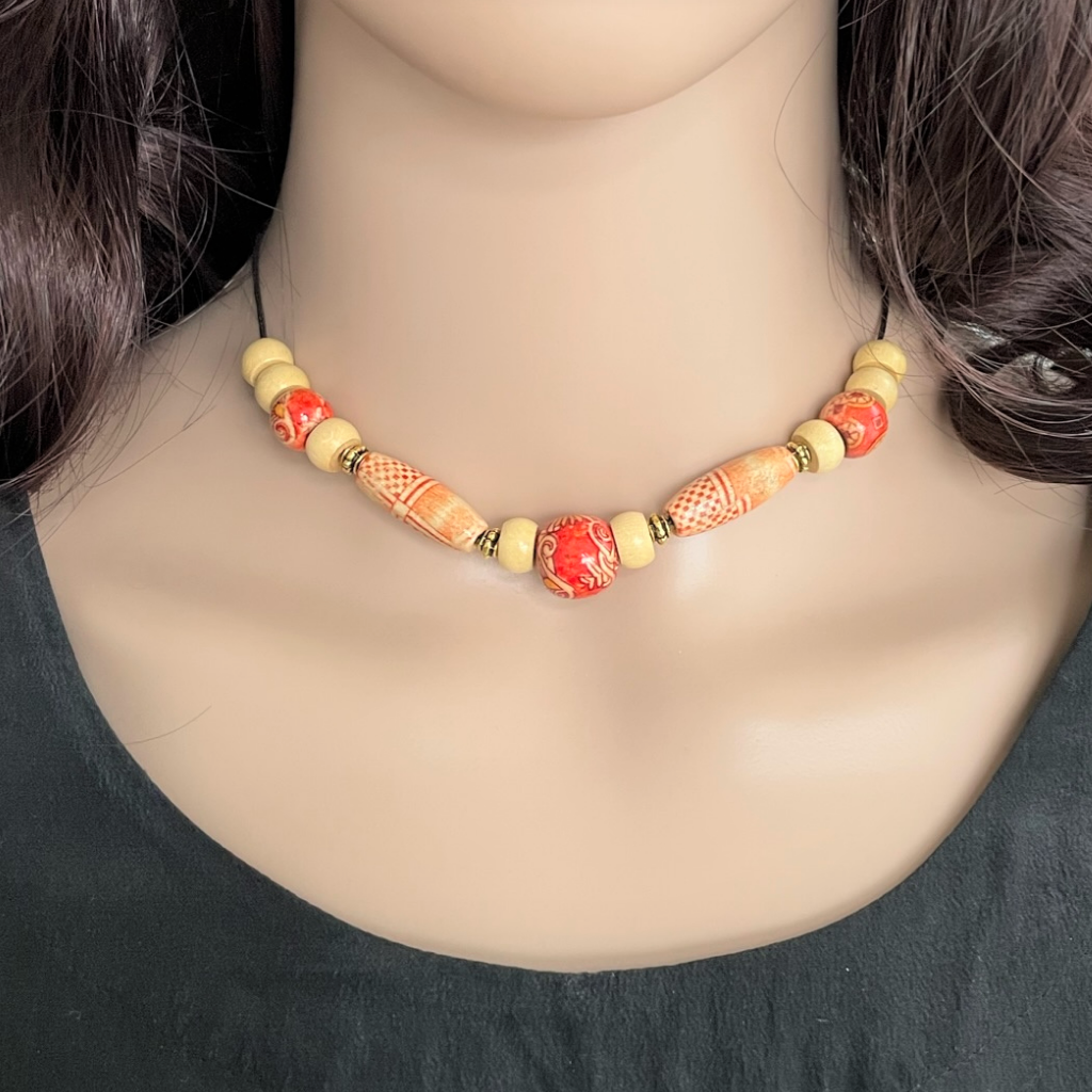 This fun necklace features a vibrant orange wooden centerpiece bead flanked by two matching orange beads, along with beige and shimmering gold accents. The main bead is 10mm, while the beige beads measure 8mm. Two unique oblong beads with golden highlights add extra charm. Strung on a brown cotton cord with a lobster clasp, this choker measures 14"—perfect for adding a pop of color to any outfit!