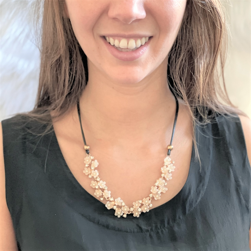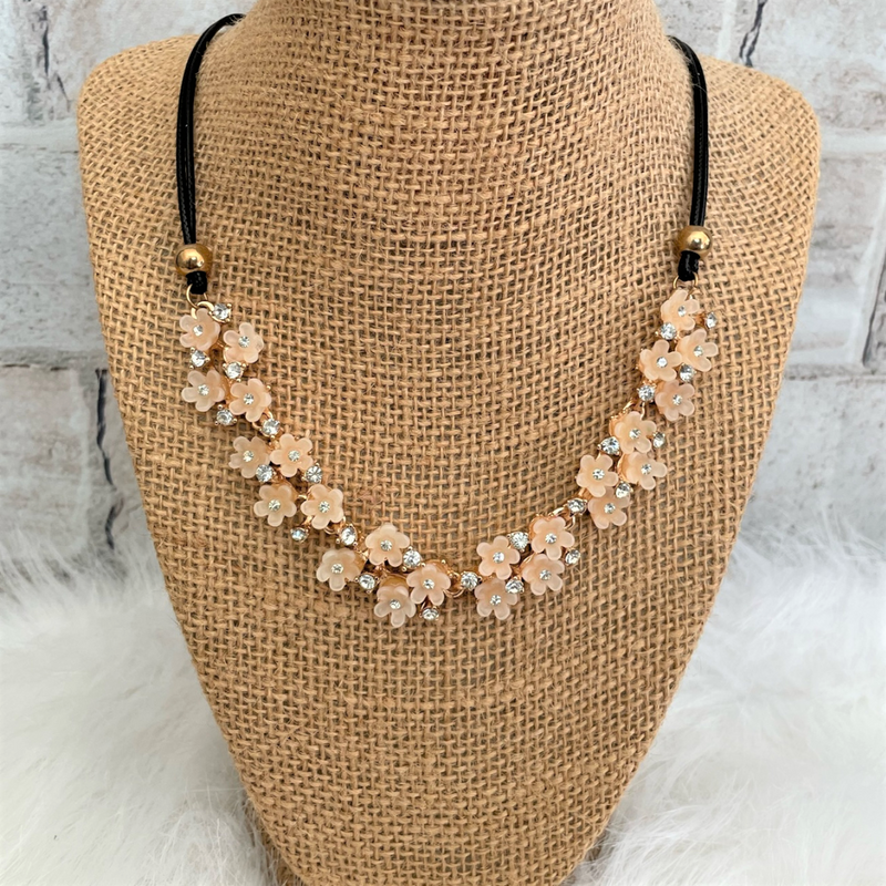 Delicate pale pink flowers adorned with sparkling rhinestones set in gold create an elegant focal point. The floral design is linked to a sleek black cord, with the flower chain measuring 7" long by 3/4" wide. This striking statement necklace spans 20" with an added extension for adjustable wear. Perfect for adding a touch of sophistication to any outfit.