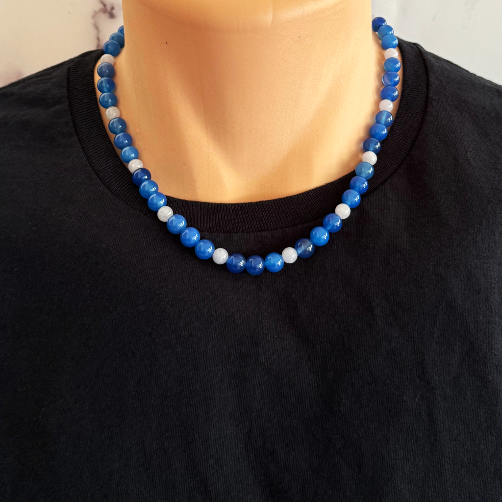 Mens Sapphire and Aquamarine Blue Agate Beaded Necklace