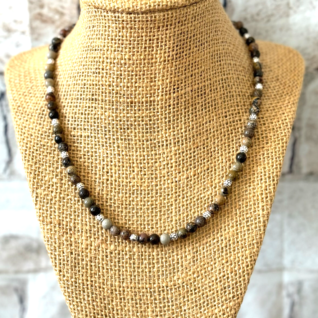 This Artistic Stone and Silver Beaded Men's Necklace features carefully handcrafted natural stones paired with silver beads. Its blend of brown, gray, and beige tones adds a sophisticated touch to any look. The 6mm beads offer a balanced, refined appearance, while the stainless steel lobster clasp ensures secure, lasting wear. Elevate your style effortlessly with this unique accessory.