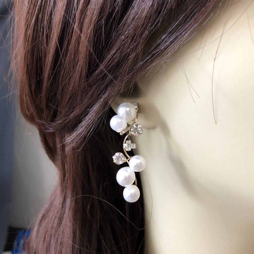 Faux pearls on a silver curved metal chain accented with large round rhinestones and mini clusters of rhinestones.