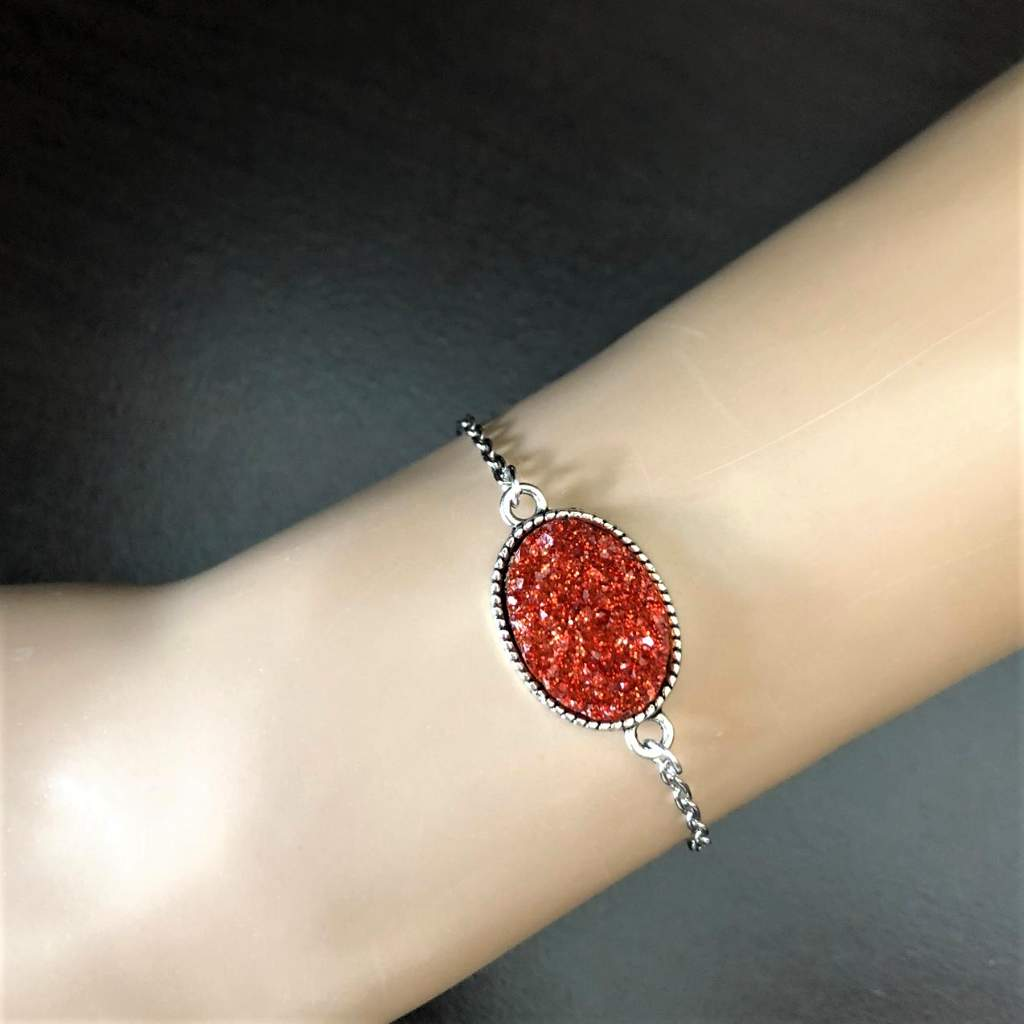 Red Druzy Oval Stone Chain Adjustable Bracelet