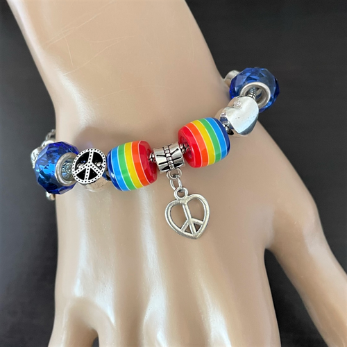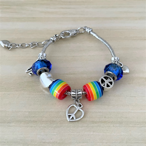 Silver Adjustable LOVE and HOPE Bangle Bracelet with Glass and Crystal Beads