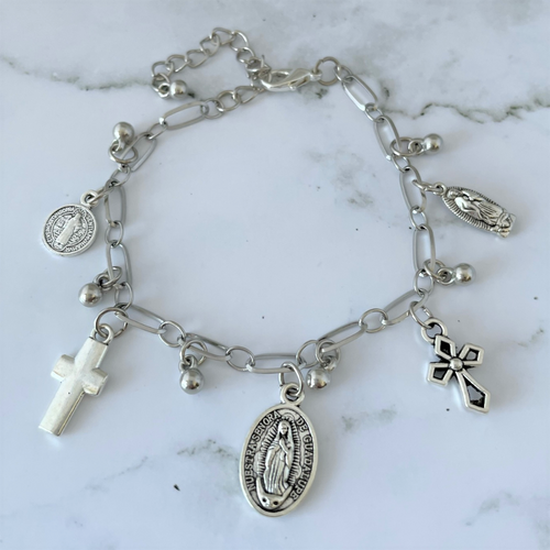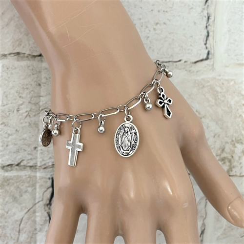 Antique Silver Religious Saints and Cross Charm Bracelet