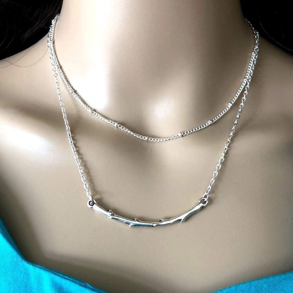 Long Silver Layered Stone and Silver Branch Necklace