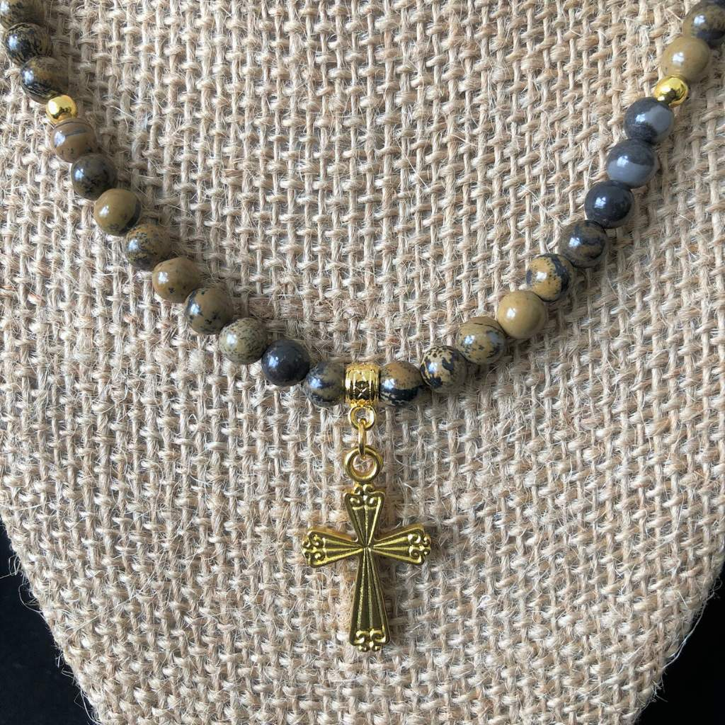 This men's necklace features natural beads in varying brown tones, highlighted with gold round accents. The Artistic Stones are 6mm in size, complemented by a finely etched gold cross measuring 1". With a 20" length and a gold stainless steel lobster clasp, this piece combines style and durability seamlessly.