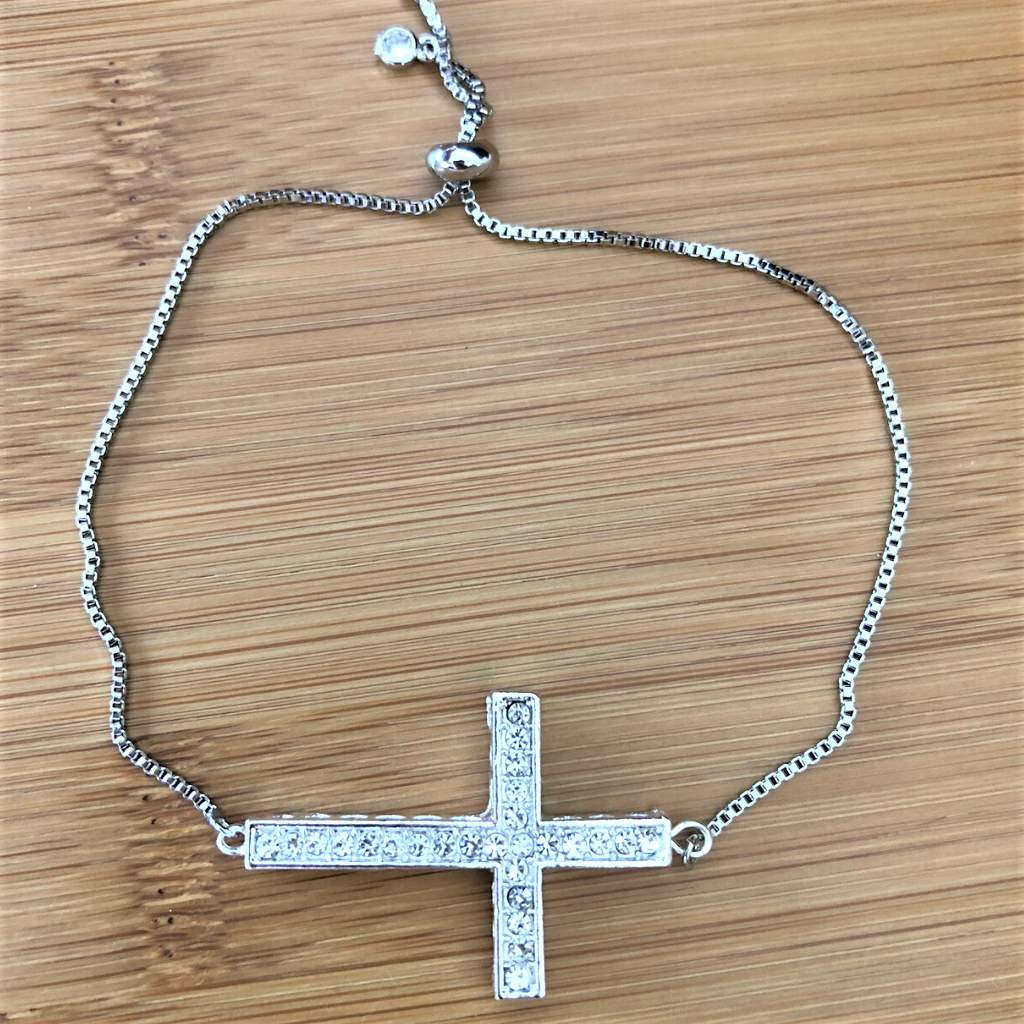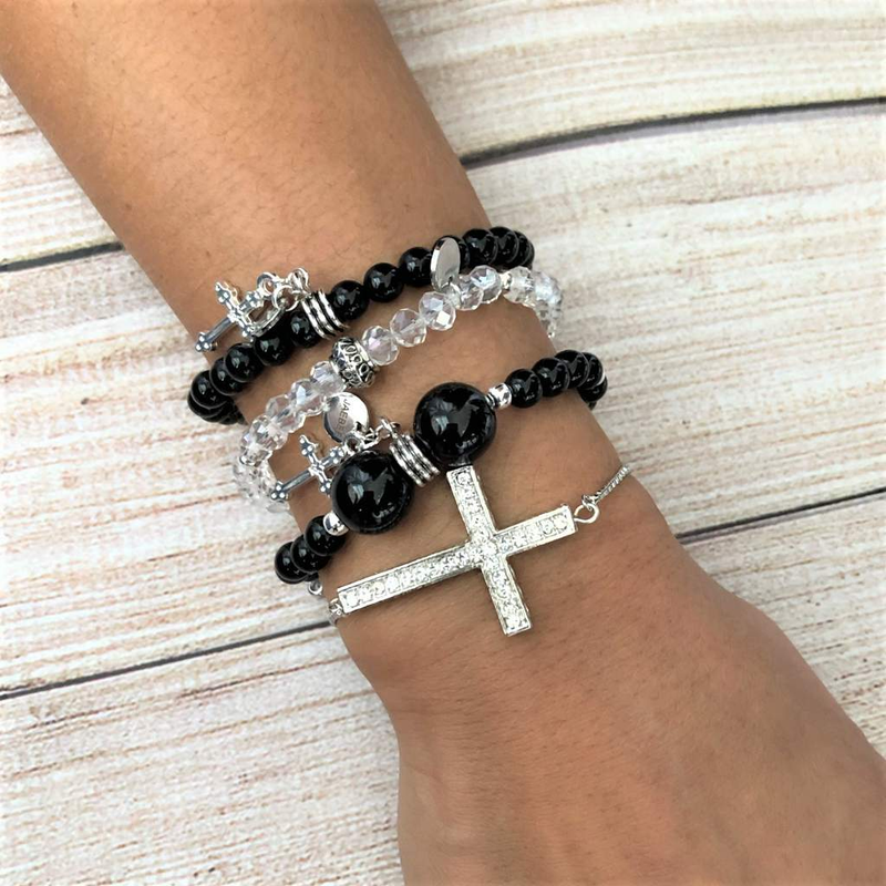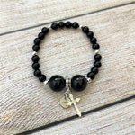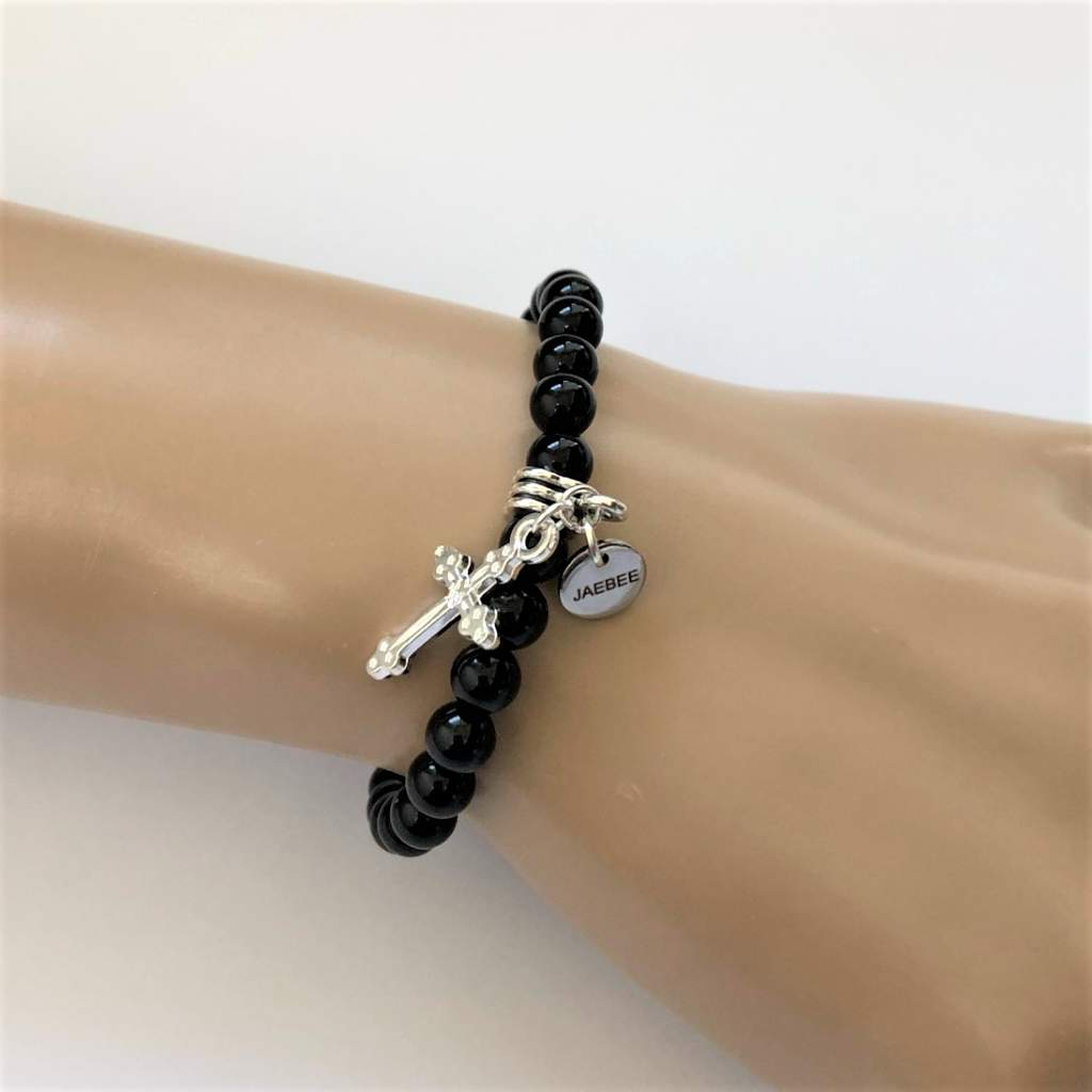 Black Onyx 6mm beaded bracelet with silver Cross charm measuring 3/4".