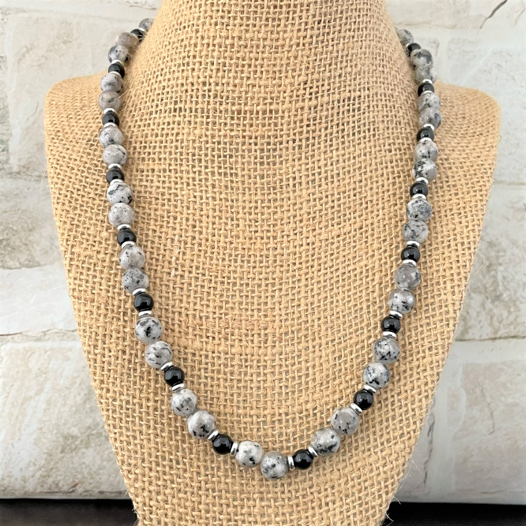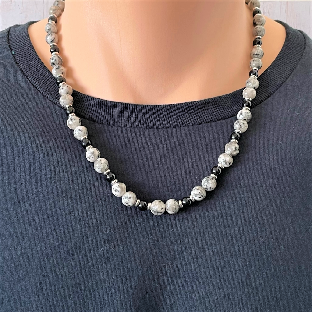 Black and White Agate Black Onyx Mens Beaded Necklace