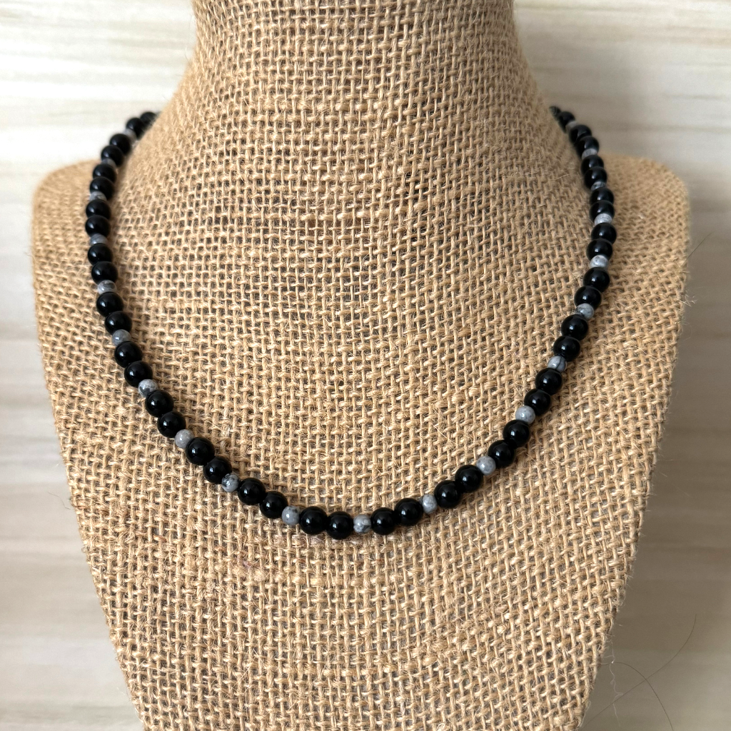 This men's necklace features striking 6mm Black Onyx beads paired with 4mm gray marbled Map beads, creating a bold and stylish contrast. Finished with a sleek sterling silver lobster clasp, it combines durability with timeless elegance. Perfect for adding a refined edge to any look.