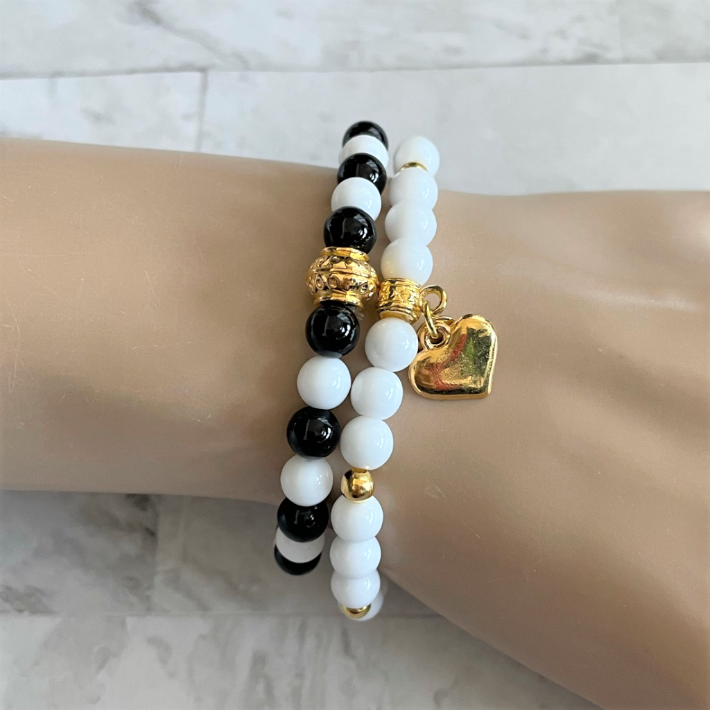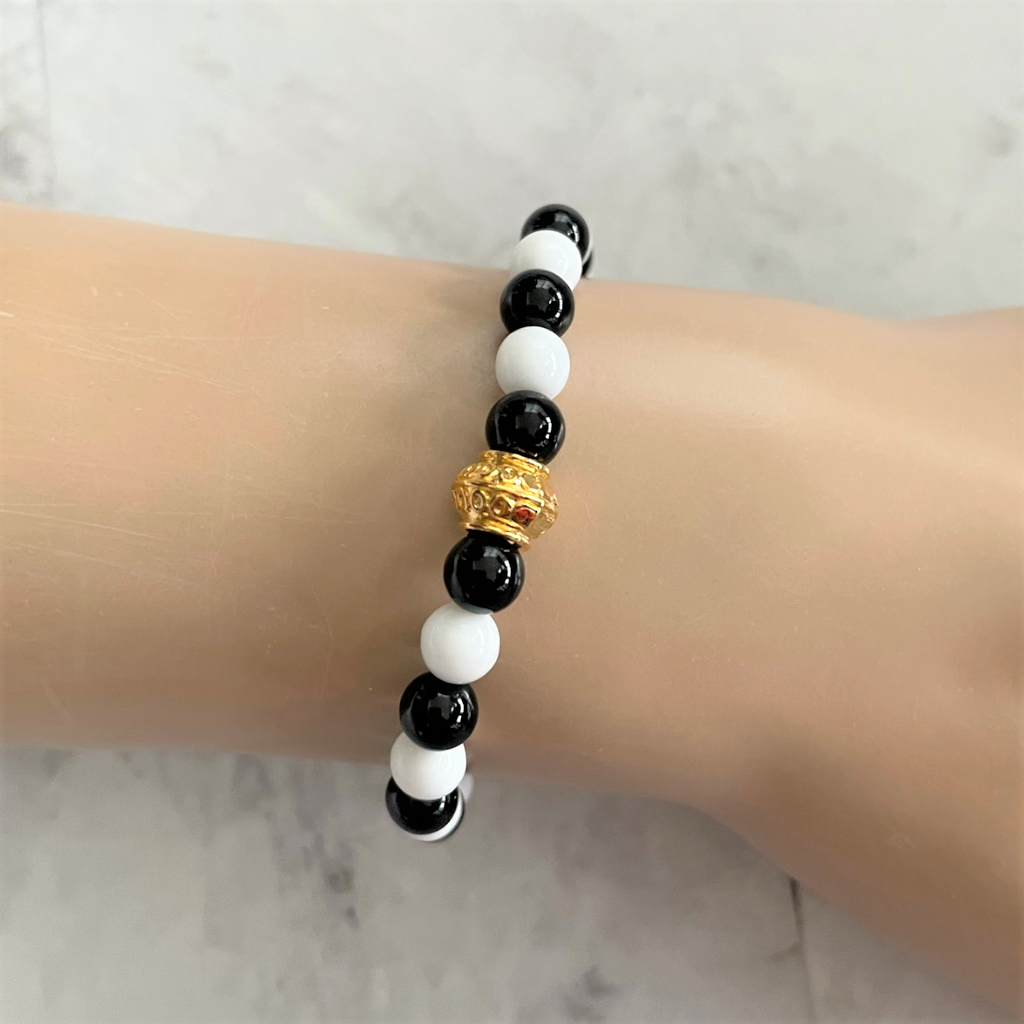 This elegant stretch bracelet showcases 6mm black onyx and white Czech beads arranged in an alternating pattern, highlighted by a refined gold accent bead.