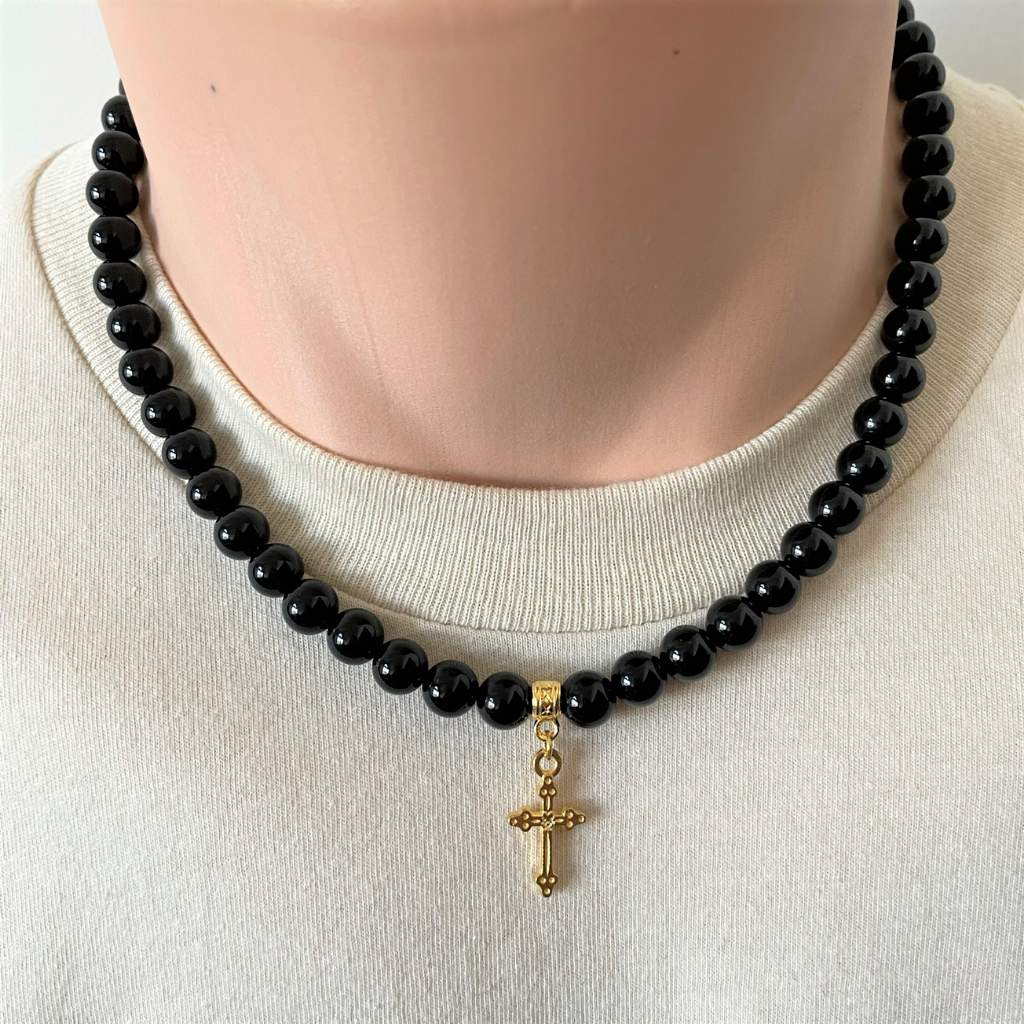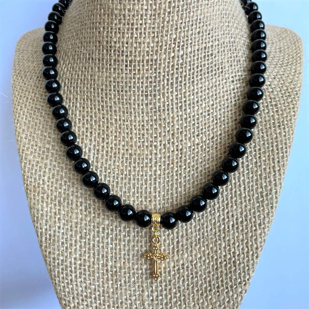 This striking necklace features glossy 8mm Black Onyx beads accented by a 1" gold Cross suspended from the center bail. It’s finished with a durable gold stainless steel lobster clasp for secure wear.