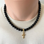 Black Onyx Mens Beaded Necklace with Gold Cross