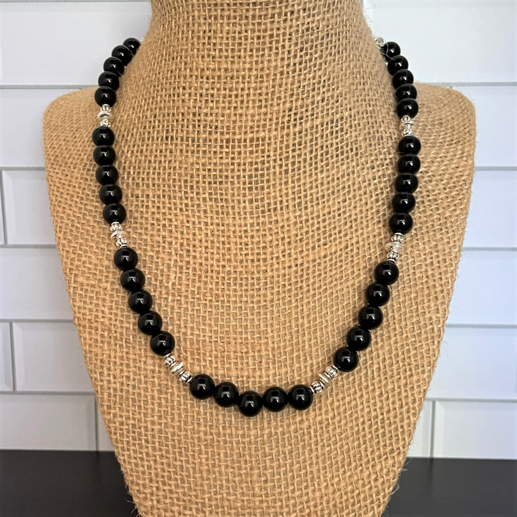 Elevate your style with this striking necklace featuring smooth 8mm Black Onyx beads, highlighted by a single silver disc and two intricately detailed 4mm silver beads. Secured with a durable sterling silver lobster clasp, it combines bold elegance with lasting quality.