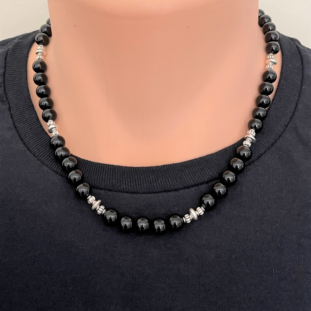 Black Onyx Mens Beaded Necklace with Silver Beads