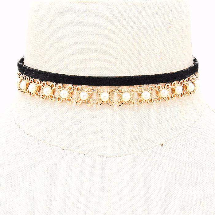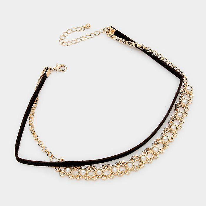 Black Suede and Gold Chain and Pearl Choker